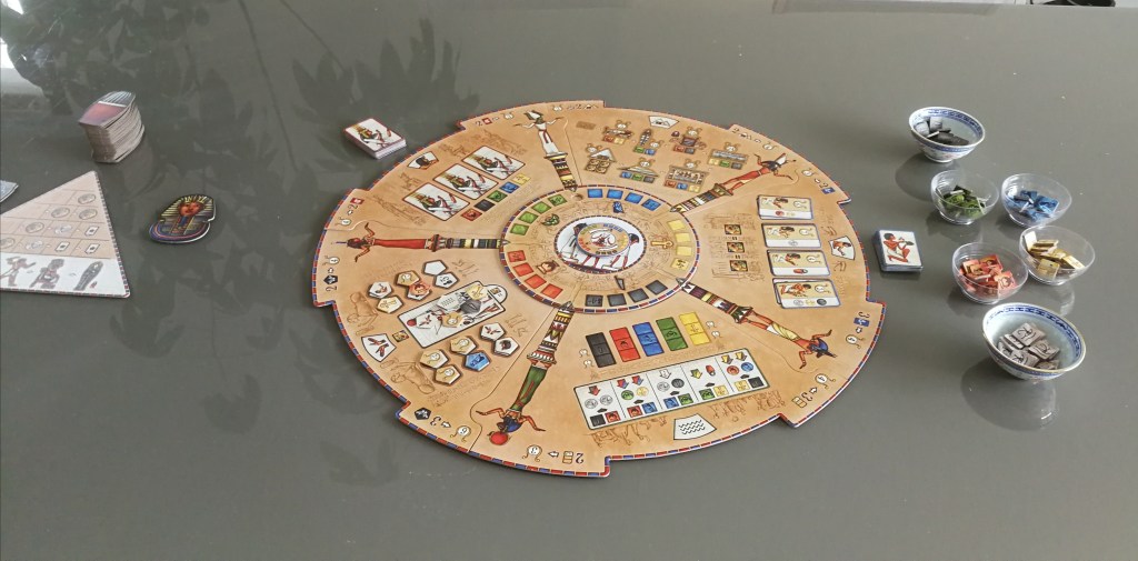 Nous avons eu l’occasion de tester Pharaon qui est un jeu assez récent, il est paru en septembre 2019 chez Catch Up Games. C’est un jeu de gestion pour 1 à 5 joueurs (une version solo existe). Les parties durent entre 1 à 2 heures. Le travail d’édition du jeu est assez remarquable, le matériel étant de qualité et le jeu très beau. Les joueurs incarnent un des enfants de Pharaon et doivent préparer leur passage dans l’au-delà. La partie se joue en 5 manches où les joueurs enchaînent les tours jusqu’à tout le monde aient passé. Les joueurs ont le choix entre 5 actions qui leur feront gagner des points de prestige et à récupérer également des ressources pour les tours suivants, qui sont une denrée assez rare. Le plateau de jeu est en forme de roue et il faut anticiper les mouvements de la Roue pour effectuer les actions au meilleur coût, et anticiper sur l’obtention ou l’utilisation des ressources. Il y a pas mal de paramètres à prendre en compte, tout étant une question de timing pour faire les bonnes actions. Le jeu mérite certainement plusieurs parties pour arriver à le maitriser. Une belle mécanique, mais le thème semble bien loin en cours de partie.