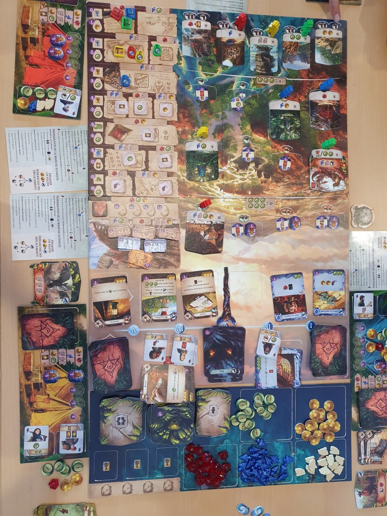 Les ruines perdues de Narak: gros jeu sorti en avril 2021 pour 1 à 4 joueurs. Le jeu combine deck building et placement d’ouvriers dans un jeu d’exploration, de gestion des ressources et de découverte. Le thème est très sympathique et rappelle Indiano Jones. Il s’agit de diriger une expédition pour explorer l’île non répertoriée de Narak et ainsi découvrir les secrets d’une civilisation disparue. Le matériel est de belle qualité. Les possibilités d’action sont un peu complexes et nombreuses au départ mais on s’y fait assez vite. Le hasard a très peu de place dans le jeu, il faut gérer ses ressources avec soin, et c’est très prenant.