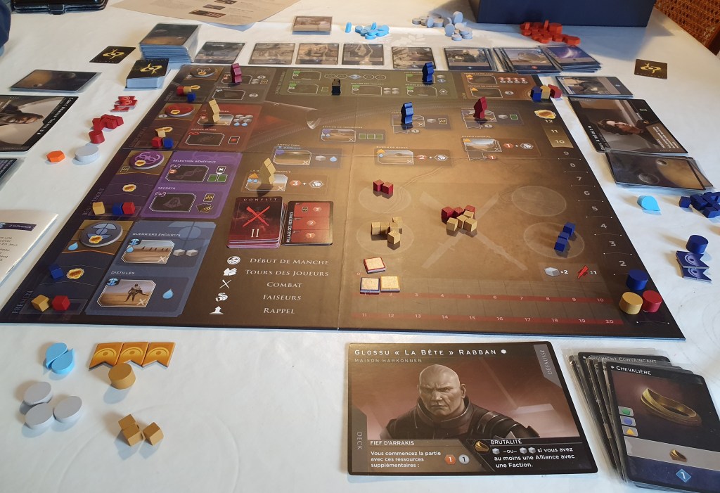 Dune Imperium : il a rejoint notre caverne, et y a trouvé une belle place. Il a obtenu l’As d’Or – Jeu de l’année catégorie expert récemment au festival des jeux de Cannes. Il est bien entendu adapté des romans de Frank Herbert, les designs sont ceux du film de Denis Villeneuve. C’est aussi un jeu de stratégie mêlant deckbuilding et placement d’ouvriers. Les joueurs interprètent un leader de l’une des grandes maisons de Landsraad. Les mécanismes sont assez fluides et le jeu vraiment prenant. Il est très différent du jeu de plateau édité en français par Jeux Descartes, dont une nouvelle mouture est aussi sortie. Pour le moment, nous avons fait 2 parties: une à 2 joueurs et une à 3. Dans celle à 3, La Maison Harkonnen a remporté le jeu avec brio. Un très bon jeu qui donne envie d’y revenir!