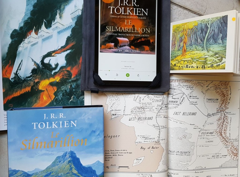 Je connaissais déjà bien Le Silmarillion, je l’ai lu personnellement 4 fois déjà depuis l’adolescence, mais l’écouter m’a fait découvrir certains passages un peu obscurs, ou difficiles d’accès. Je reste persuadé qu’il faut lire ce texte avec 2 aides visuelles : une cartographie plus détaillée que celle proposée dans l’édition papier, et des arbres généalogiques des différentes branches d’elfes et familles humaines. Sans cela, il semble impossible de tout retenir, tant le récit foisonne de noms. Ayant une mémoire plus visuelle qu’auditive, l’apport de supports papiers et de cartes me permet de tracer au mieux les voyages, les batailles, et de bien situer les personnages au sein de chaque famille. C’est là tout l’avantage du livre audio, puisqu’il permet tout en écoutant le récit, de suivre en même temps ces supports papiers, évitant d’incessants allers et retours vers un glossaire, une carte, ou un schéma. C’est bête mais l’immersion n’en est que plus grande.