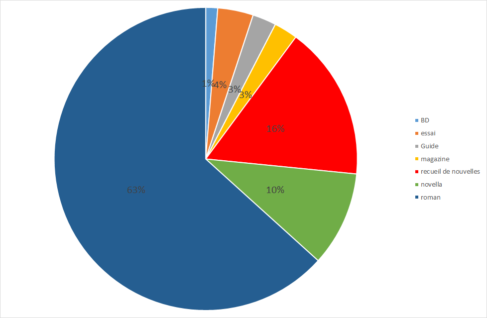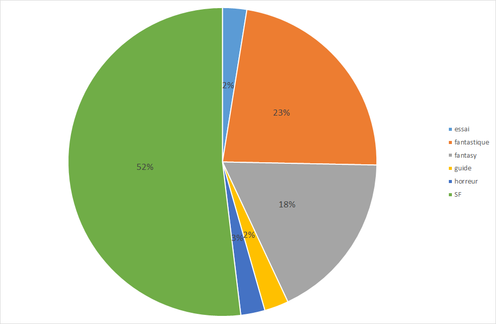 Pour la répartition par genre, la Sf arrive toujours en premier avec quasiment la moitié de mes lectures: