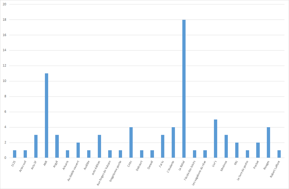 L’éditeur le plus lu (loin devant) est Le Bélial’, suivi par Albin Michel Imaginaire :